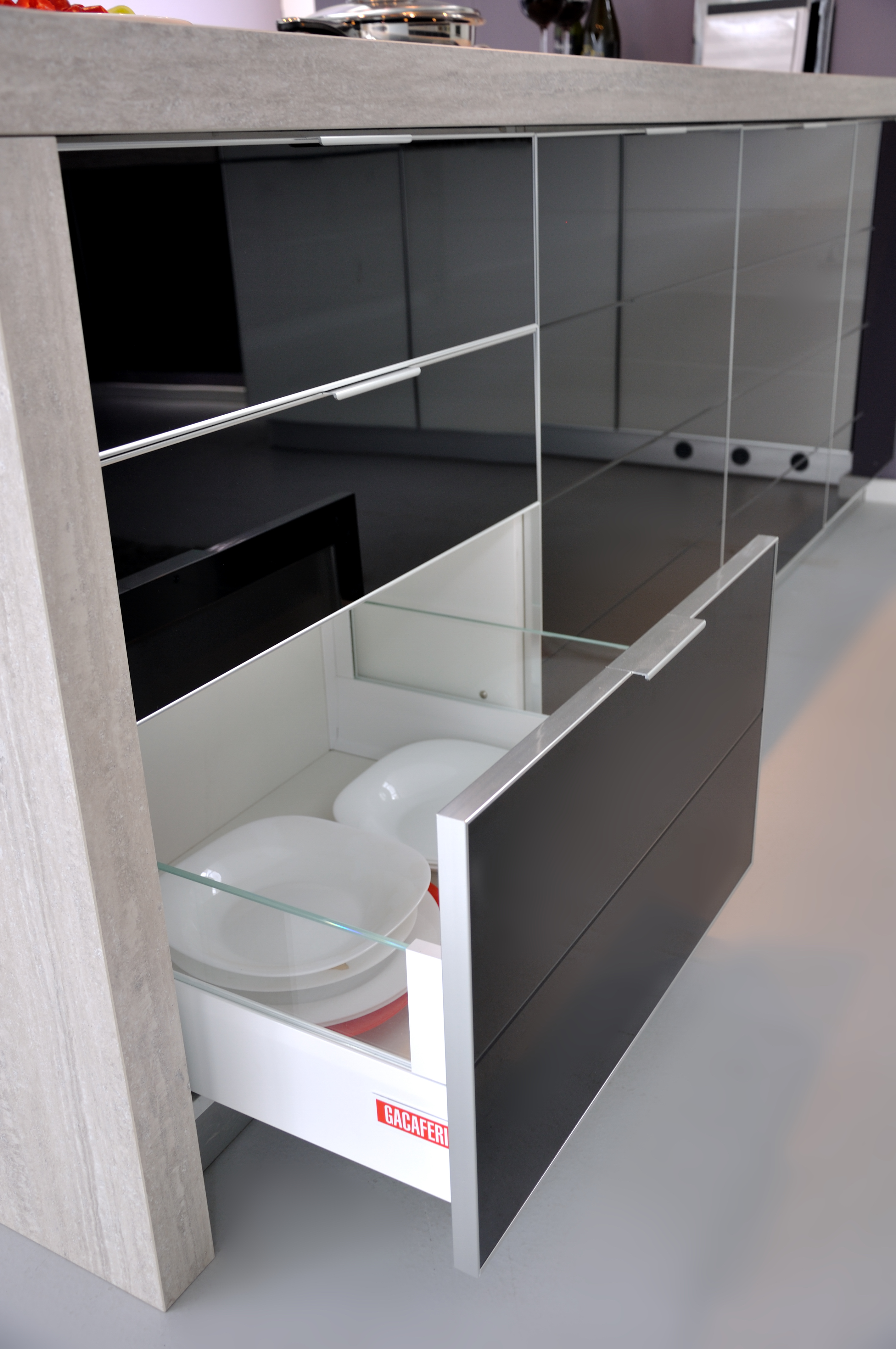 Luksoz dhe funksional në të njëjtën kohë – kuzhinat Gacaferi në shkëlqim të zi: një ndërveprim me kontrast midis xhamit dhe metalit, dyert e tij të shkëlqyera me shkëlqim kanë një kornizë metalike të përbërë nga çeliku. I kombinuar me xham ultra të bardhë krijon një tipar interesant me ngjyra që impresionon dhe me ndjenjën e materialit, por edhe me vëmendje të përcaktuar.